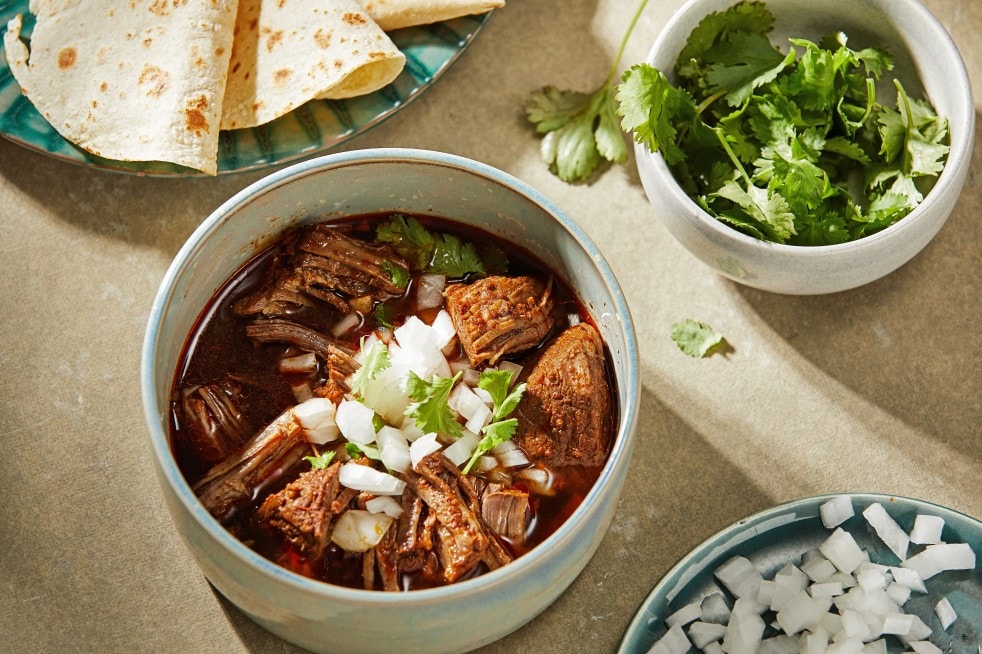 Birria is often served at special occasions or holidays, such as weddings and Christmas. Preparation techniques vary, but the meat is always marinated in an adobo sauce made of vinegar, dried chillies, herbs and spices before cooked in a broth and then served with corn tortillas and garnished with chopped onion, cilantro and drizzled with lime juice.